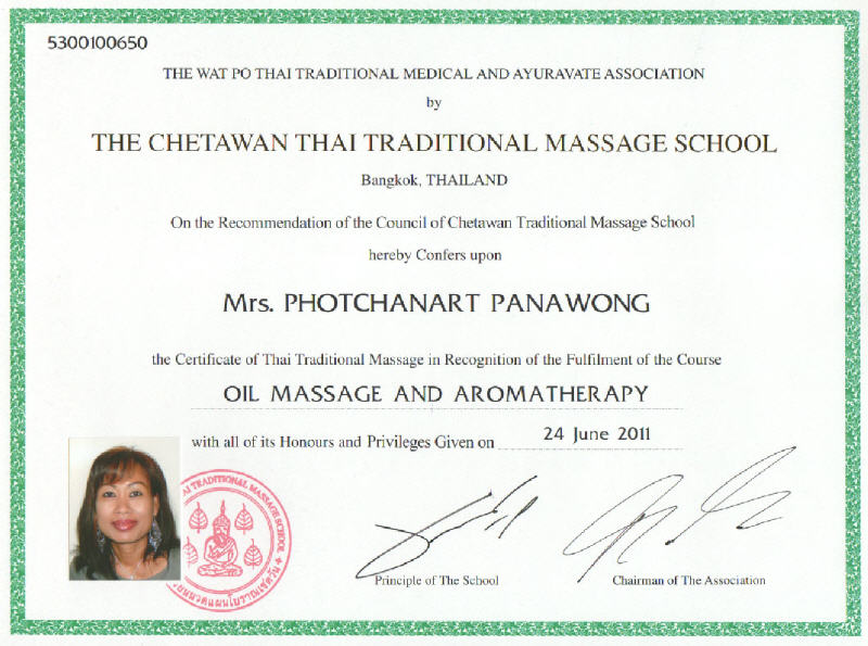 Photchanart Weinmann ist stolze Inhaberin des renommierten Wat Po Zertifikats, das eine erstklassige Ausbildung in der traditionellen thailändischen Massage bescheinigt. Dieses Zertifikat wird an Therapeuten vergeben, die die Standards der berühmten Wat Po Schule in Bangkok, Thailand, erfolgreich durchlaufen haben. Diese Schule ist eine der ältesten und angesehensten Einrichtungen für die Lehre der Thai-Massage und steht für höchste Qualität und Professionalität.